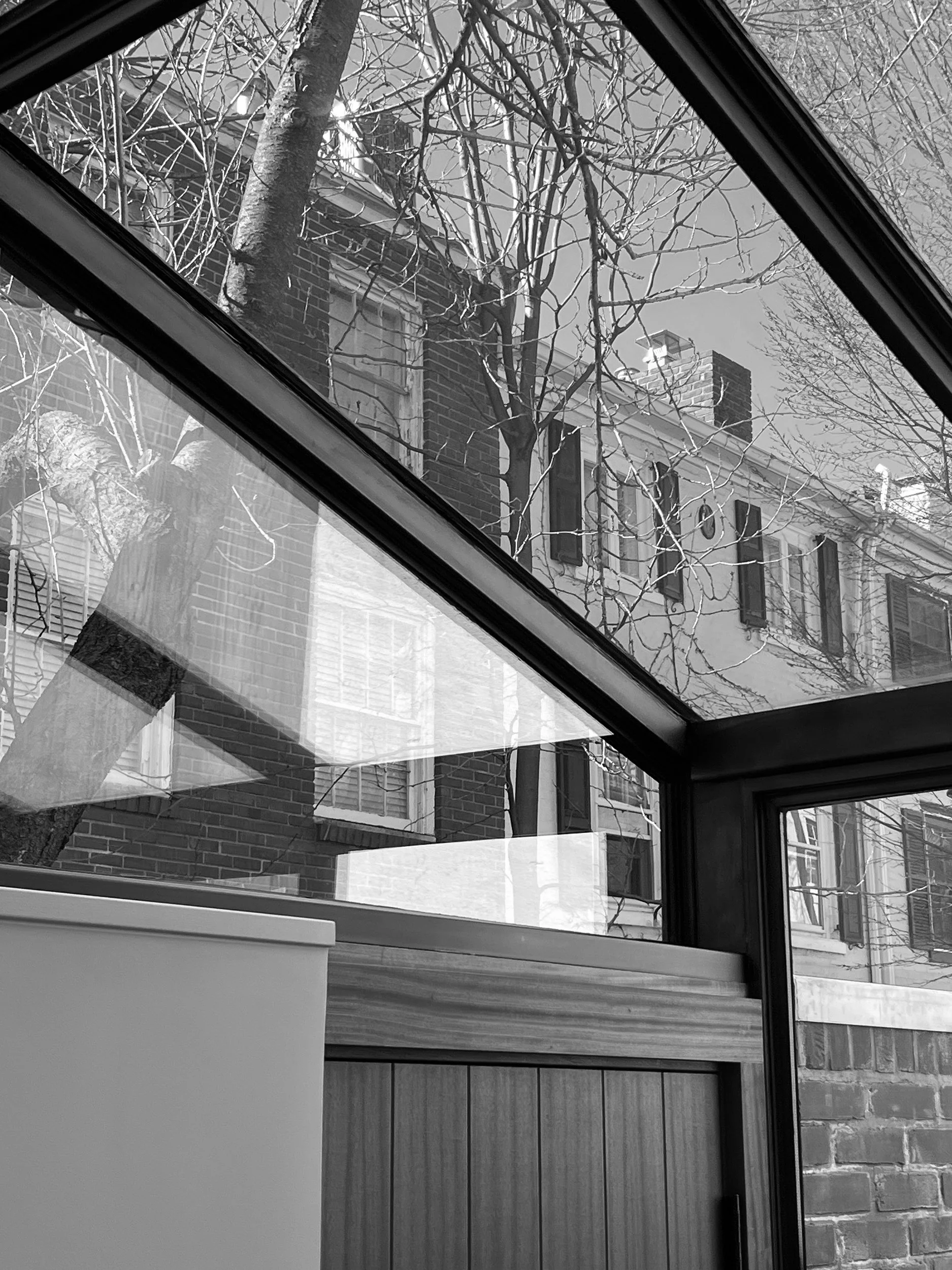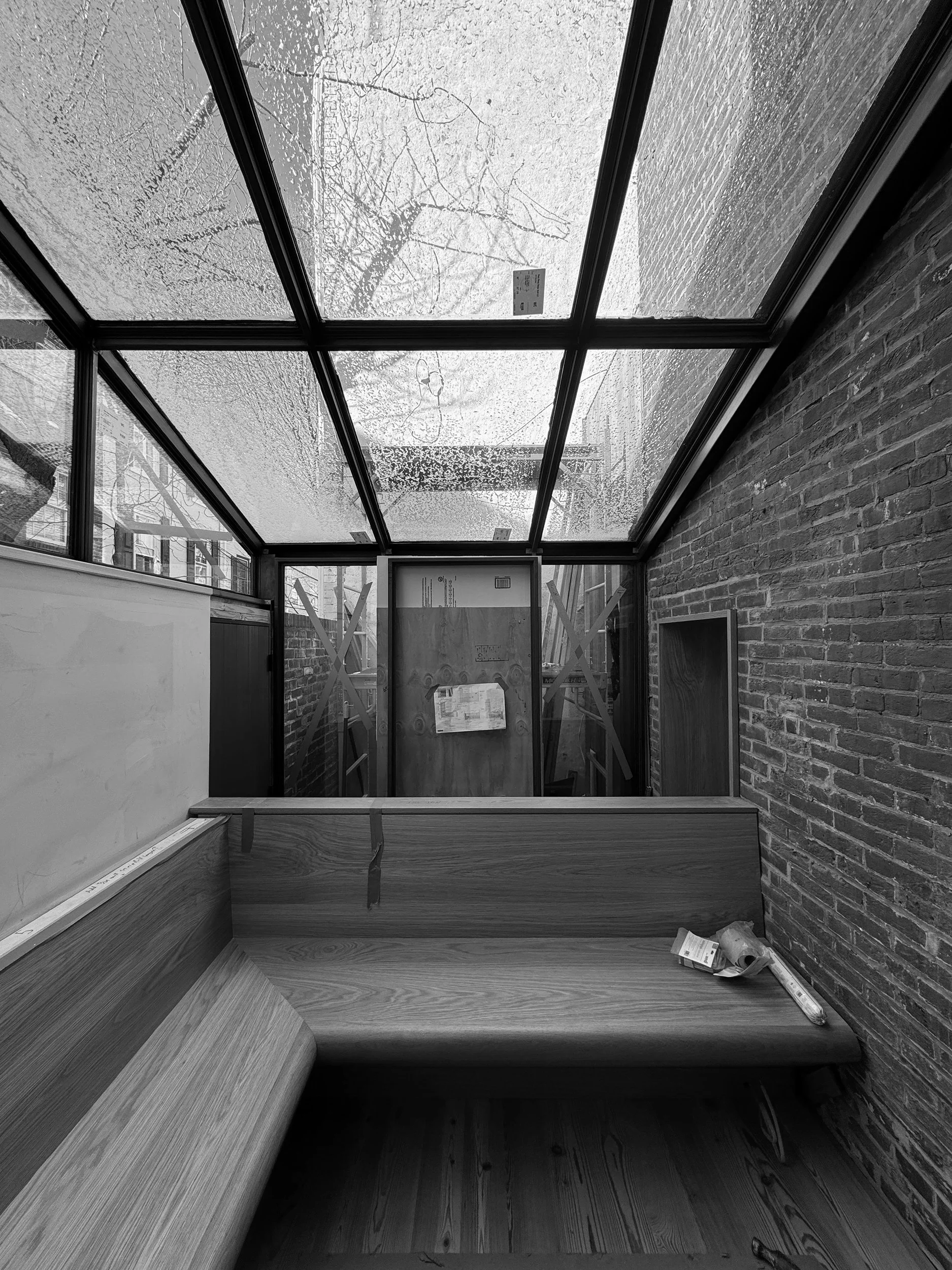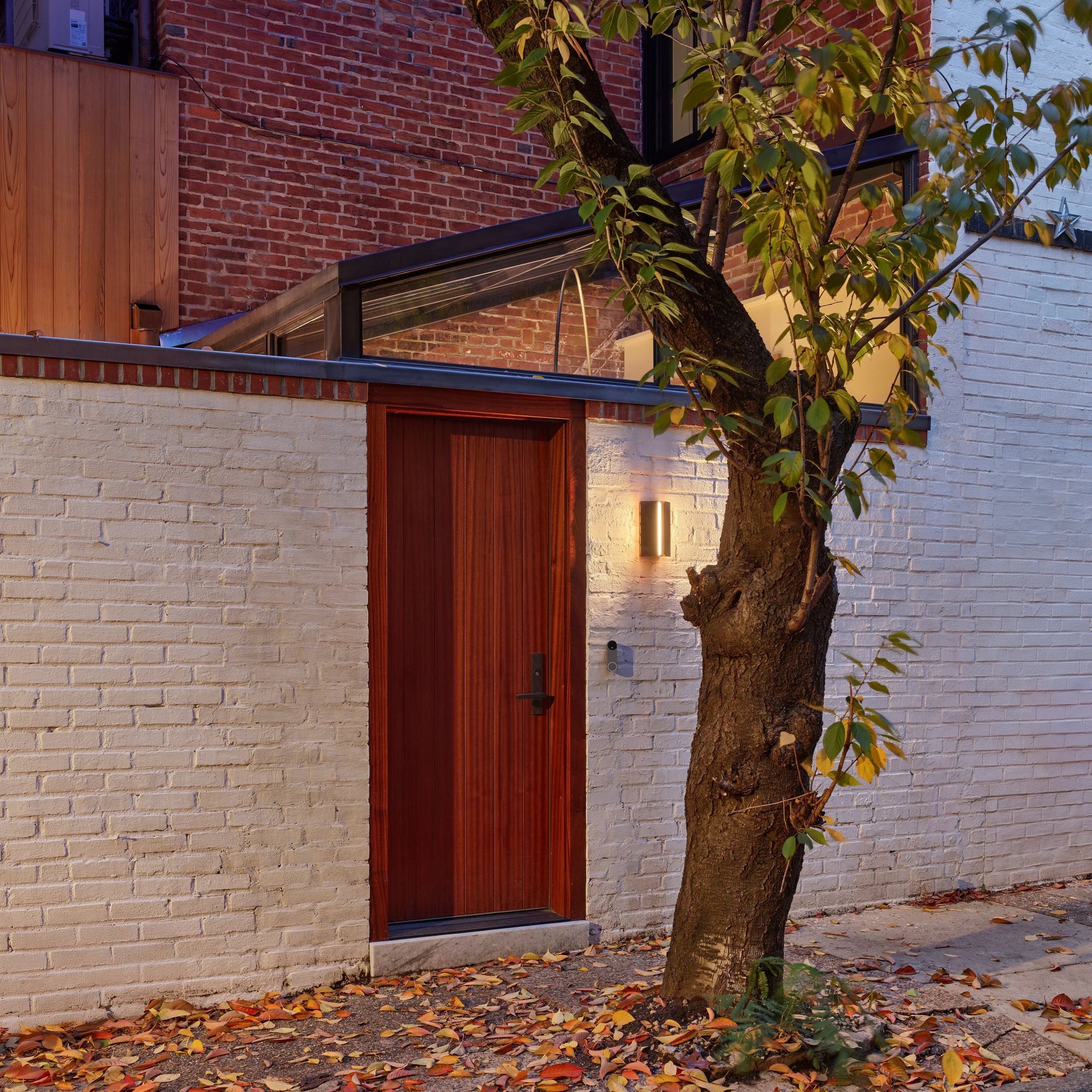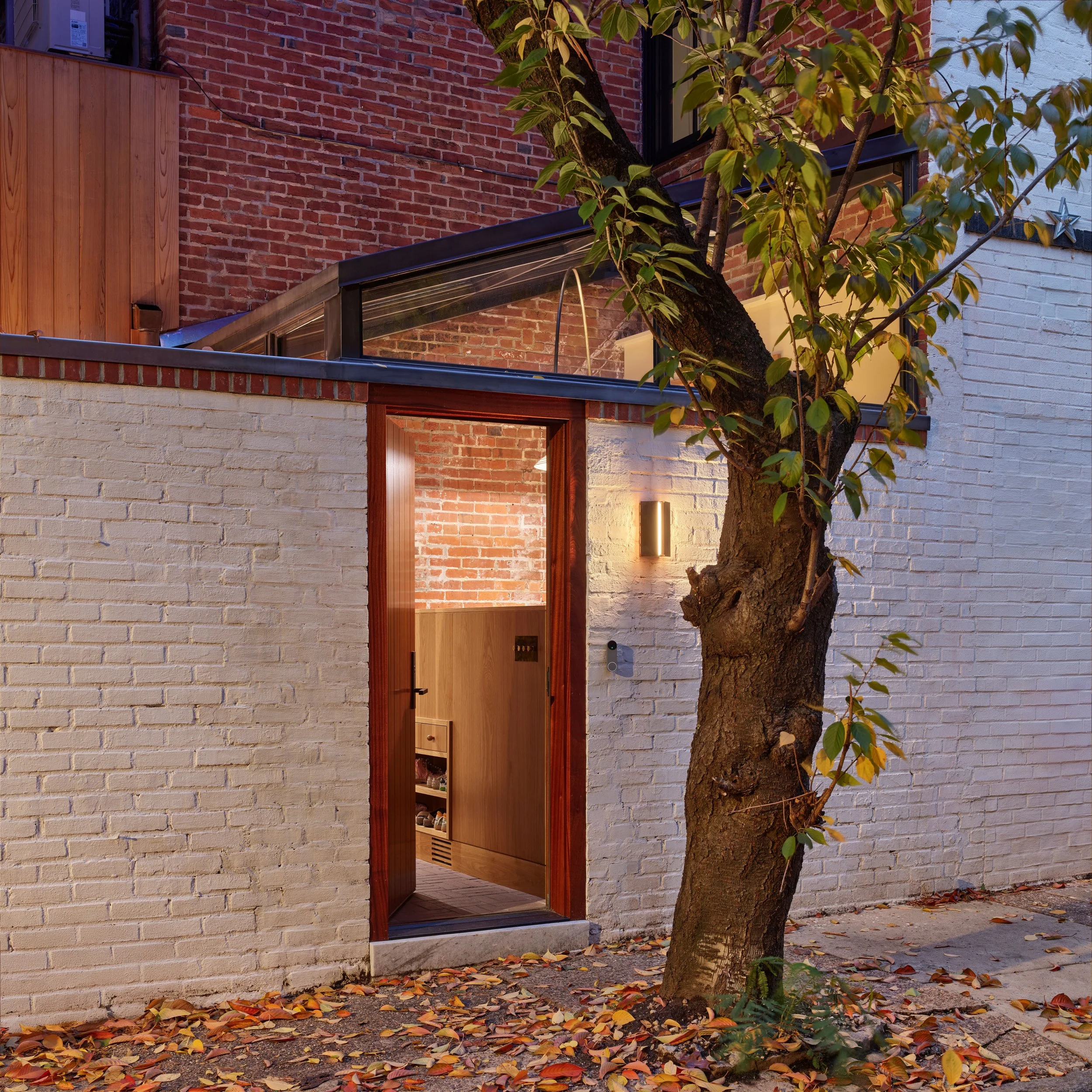 Tucked on a cobblestone corner in historic Fitler Square, this early-1800s brick town house was completely rebuilt behind its original walls to create a bright, modern home for a young family. A new steel-and-glass kitchen solarium and rear addition bring light deep into the narrow 15-foot-wide footprint while making room for a hardworking mudroom and powder room at the alley entrance. Throughout the house, white oak built-ins, reclaimed heart pine floors, and exposed brick honor the original character—maximizing storage and circulation on every level while preserving the integrity of the historic shell. Up top, a vaulted primary suite with skylights, custom millwork, a generous bath, and steam shower turns the once-cramped third floor into a calm retreat above the city.