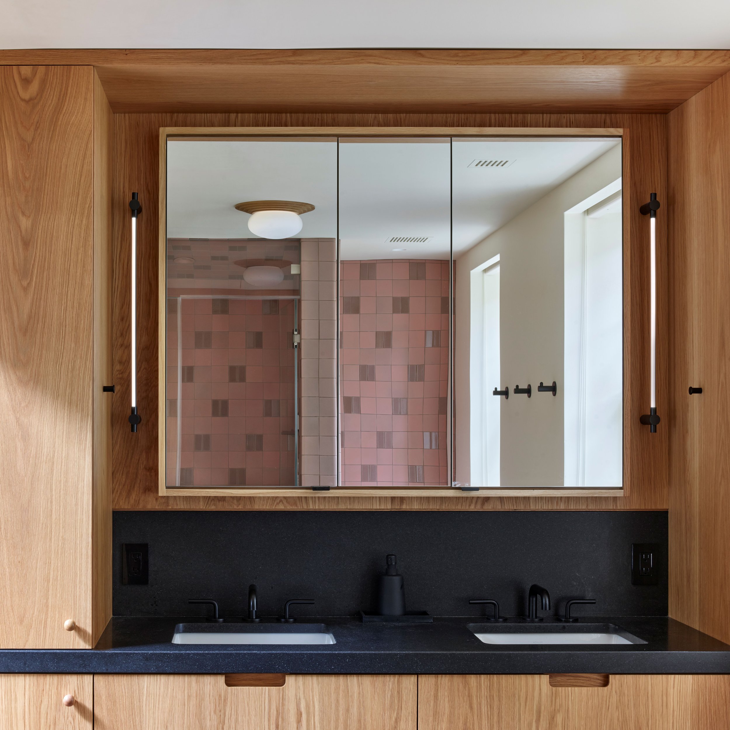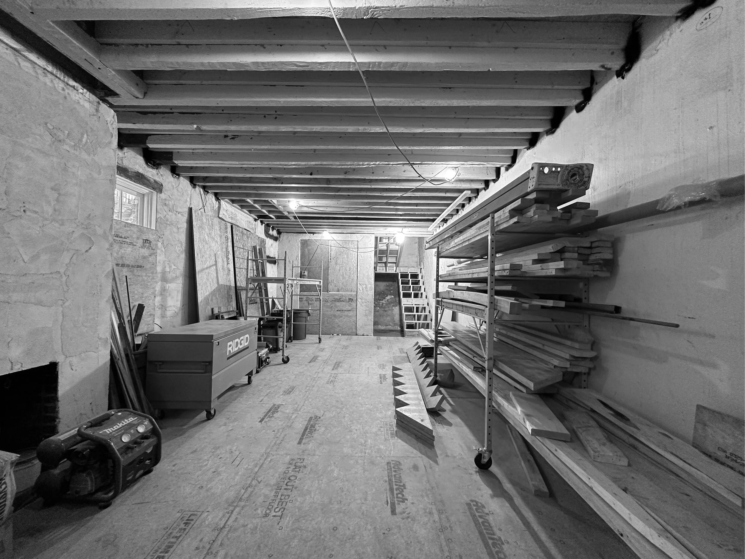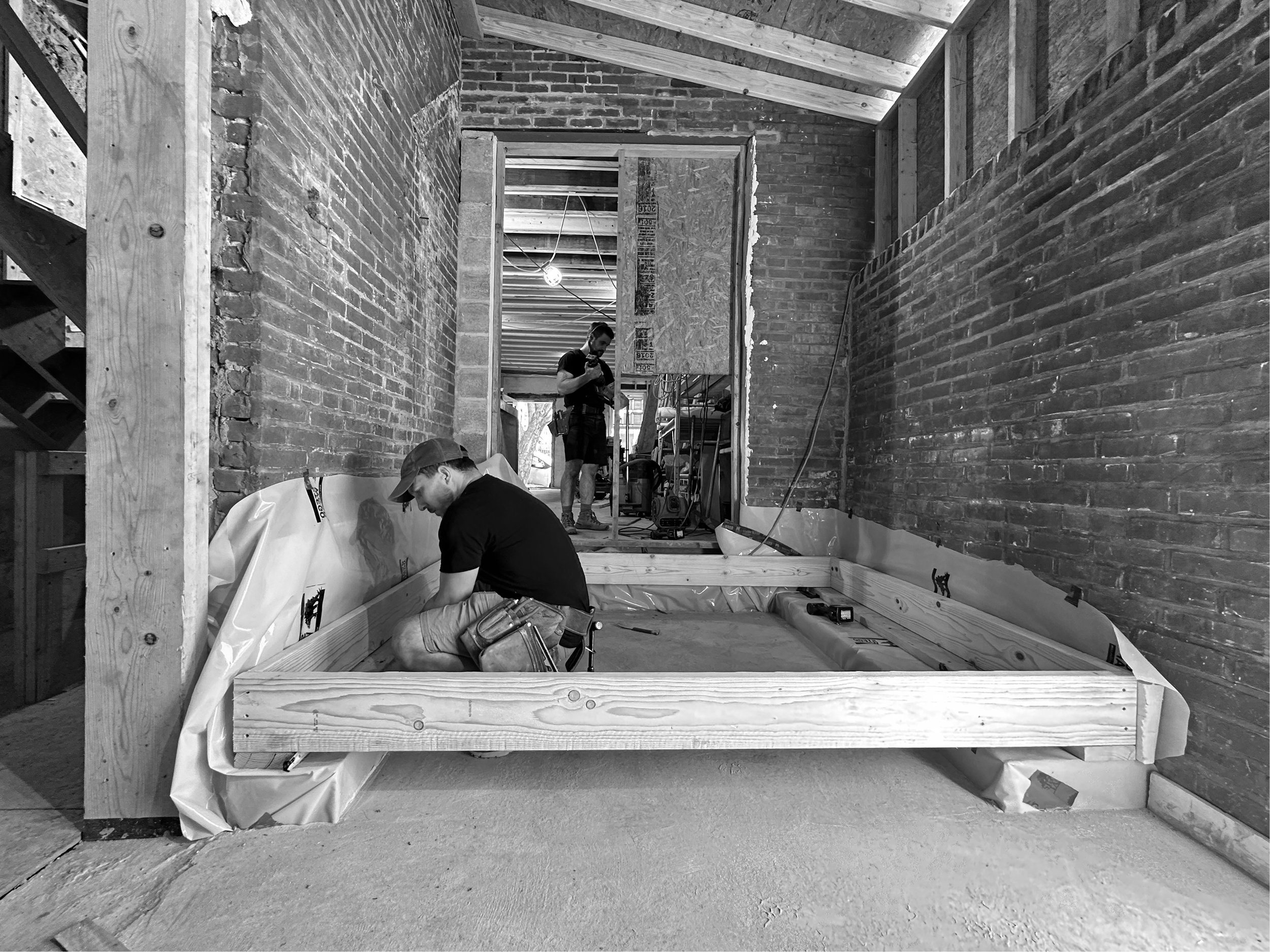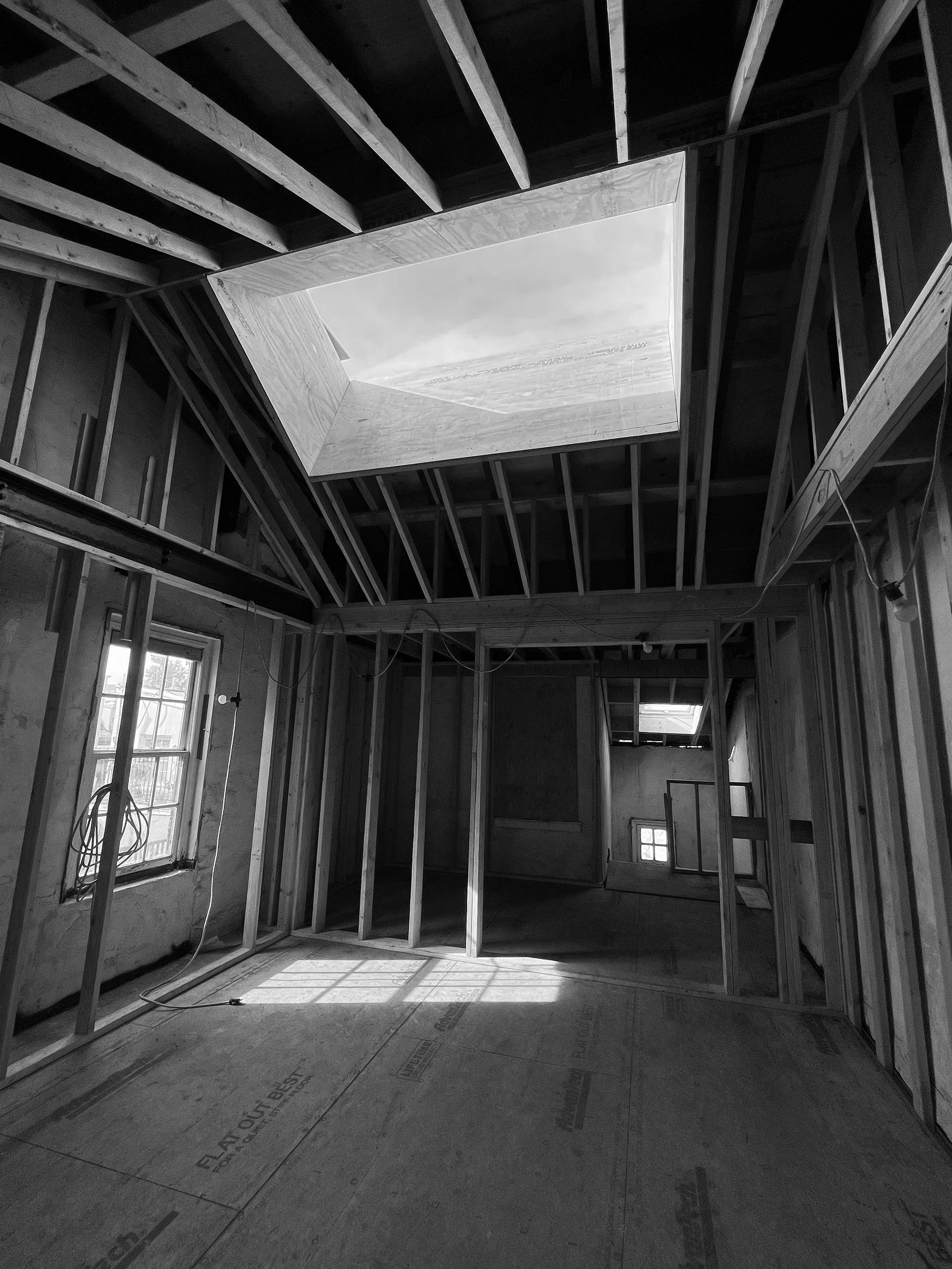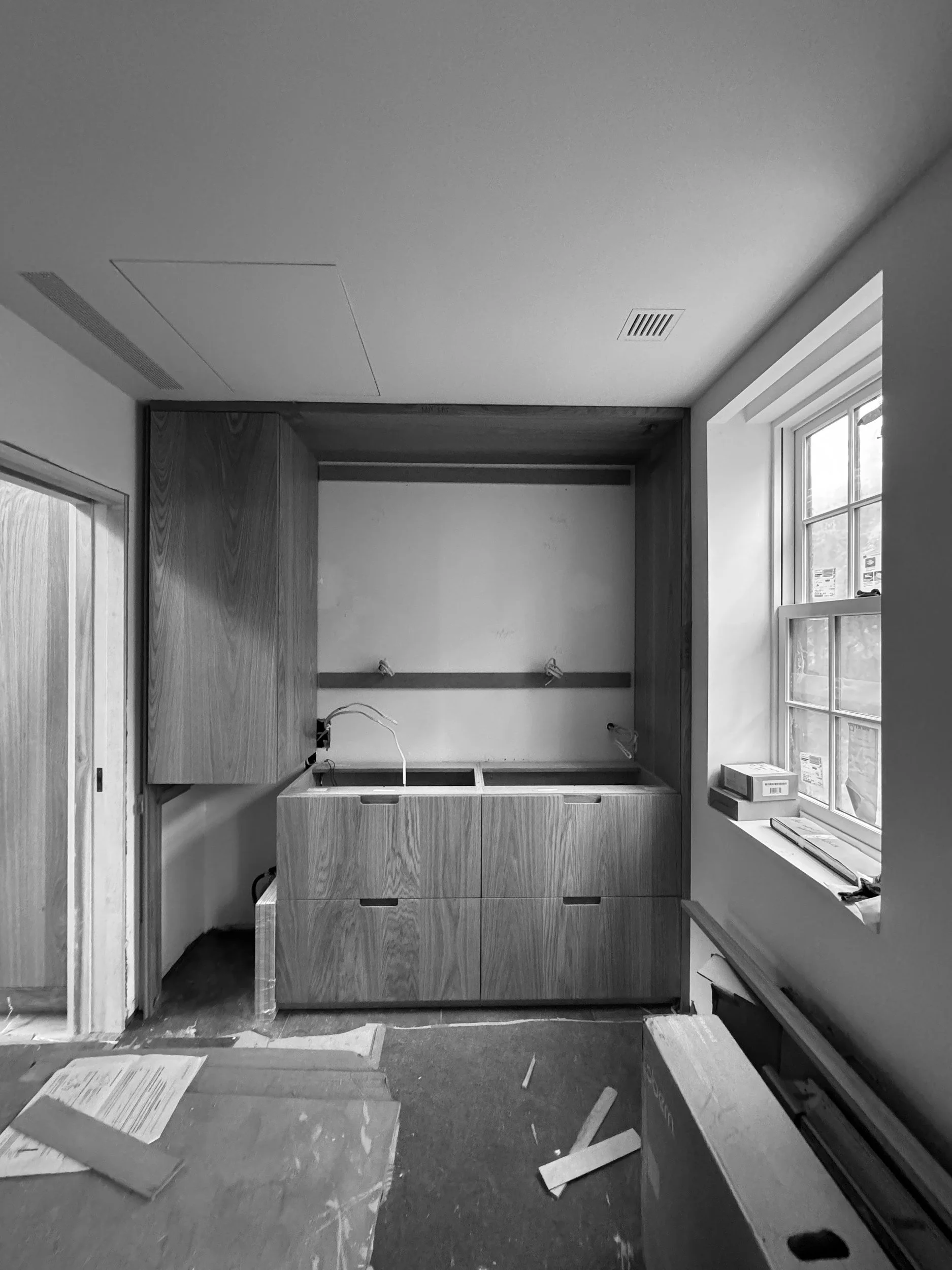 Tucked on a cobblestone corner in historic Fitler Square, this early-1800s brick town house was completely rebuilt behind its original walls to create a bright, modern home for a young family. A new steel-and-glass kitchen solarium and rear addition bring light deep into the narrow 15-foot-wide footprint while making room for a hardworking mudroom and powder room at the alley entrance. Throughout the house, white oak built-ins, reclaimed heart pine floors, and exposed brick honor the original character—maximizing storage and circulation on every level while preserving the integrity of the historic shell. Up top, a vaulted primary suite with skylights, custom millwork, a generous bath, and steam shower turns the once-cramped third floor into a calm retreat above the city.