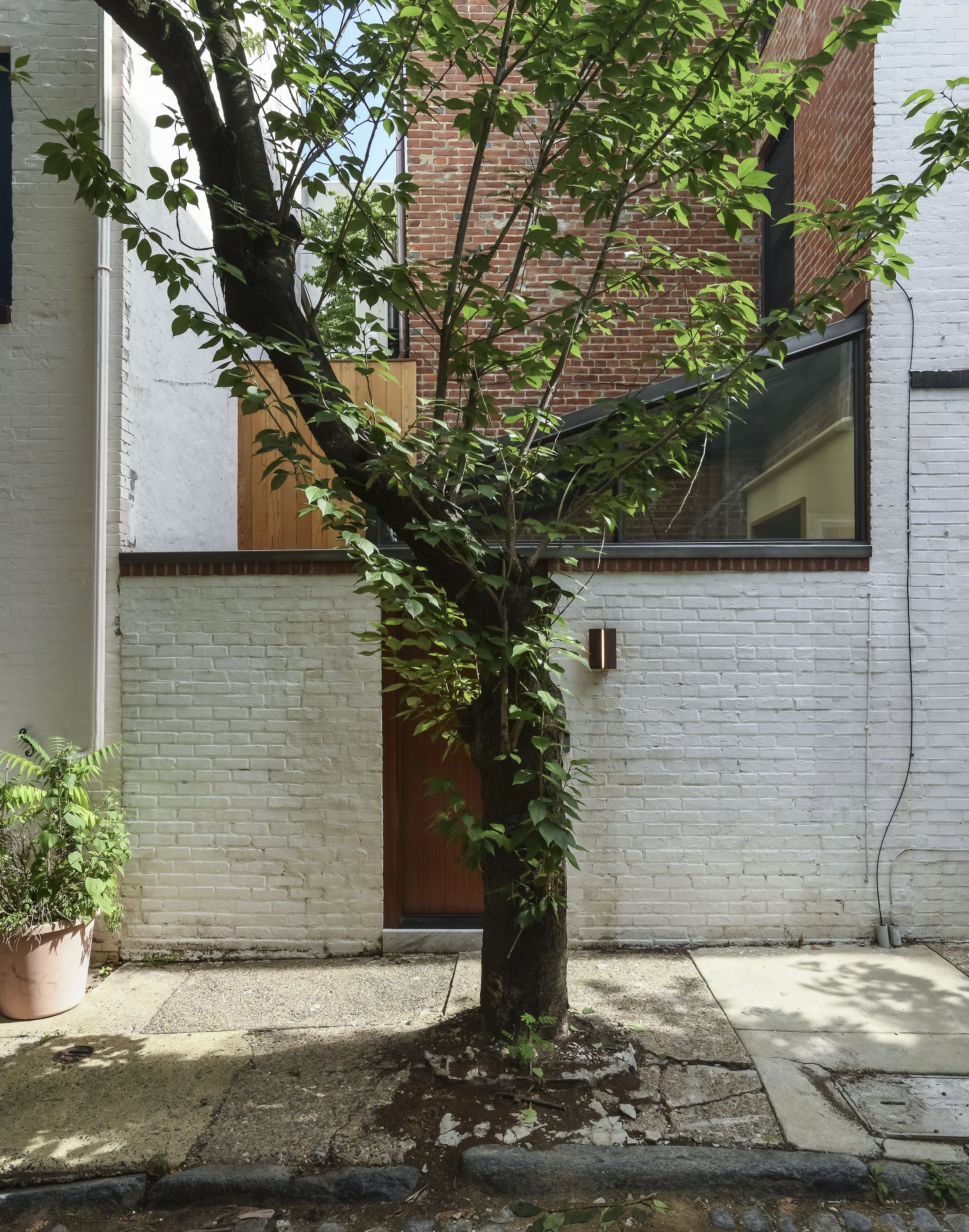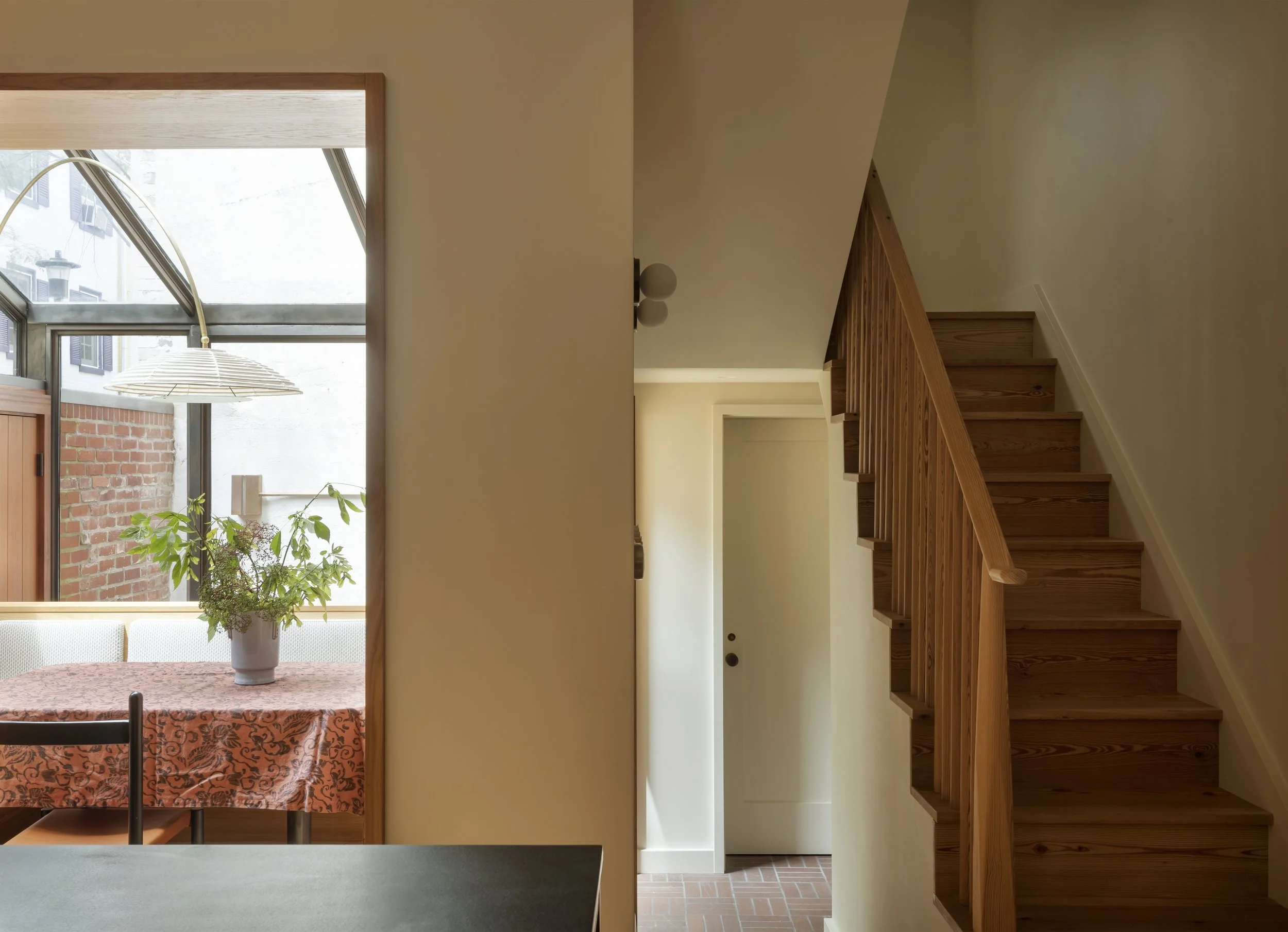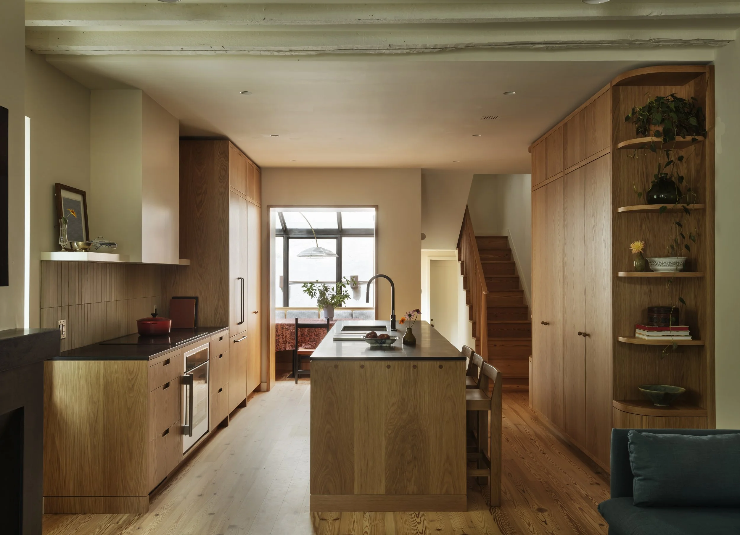 Tucked on a cobblestone corner in historic Fitler Square, this early-1800s brick town house was completely rebuilt behind its original walls to create a bright, modern home for a young family. A new steel-and-glass kitchen solarium and rear addition bring light deep into the narrow 15-foot-wide footprint while making room for a hardworking mudroom and powder room at the alley entrance. Throughout the house, white oak built-ins, reclaimed heart pine floors, and exposed brick honor the original character—maximizing storage and circulation on every level while preserving the integrity of the historic shell. Up top, a vaulted primary suite with skylights, custom millwork, a generous bath, and steam shower turns the once-cramped third floor into a calm retreat above the city.