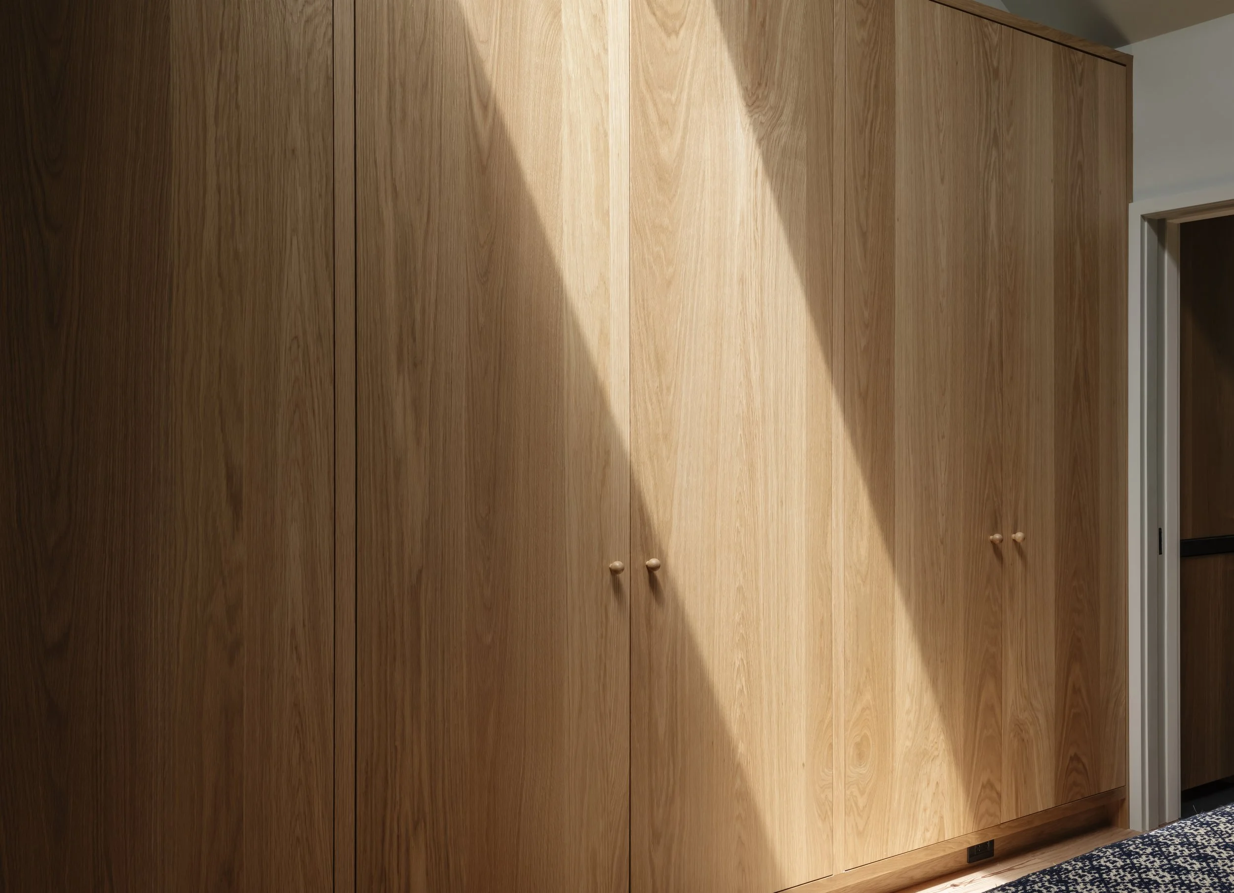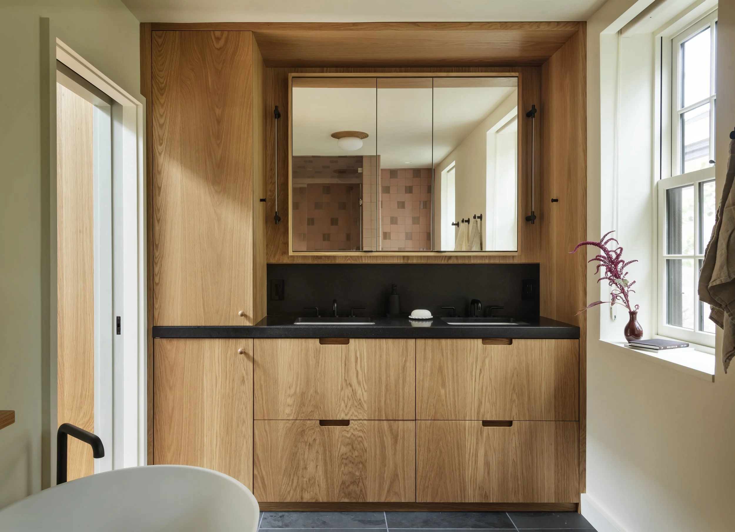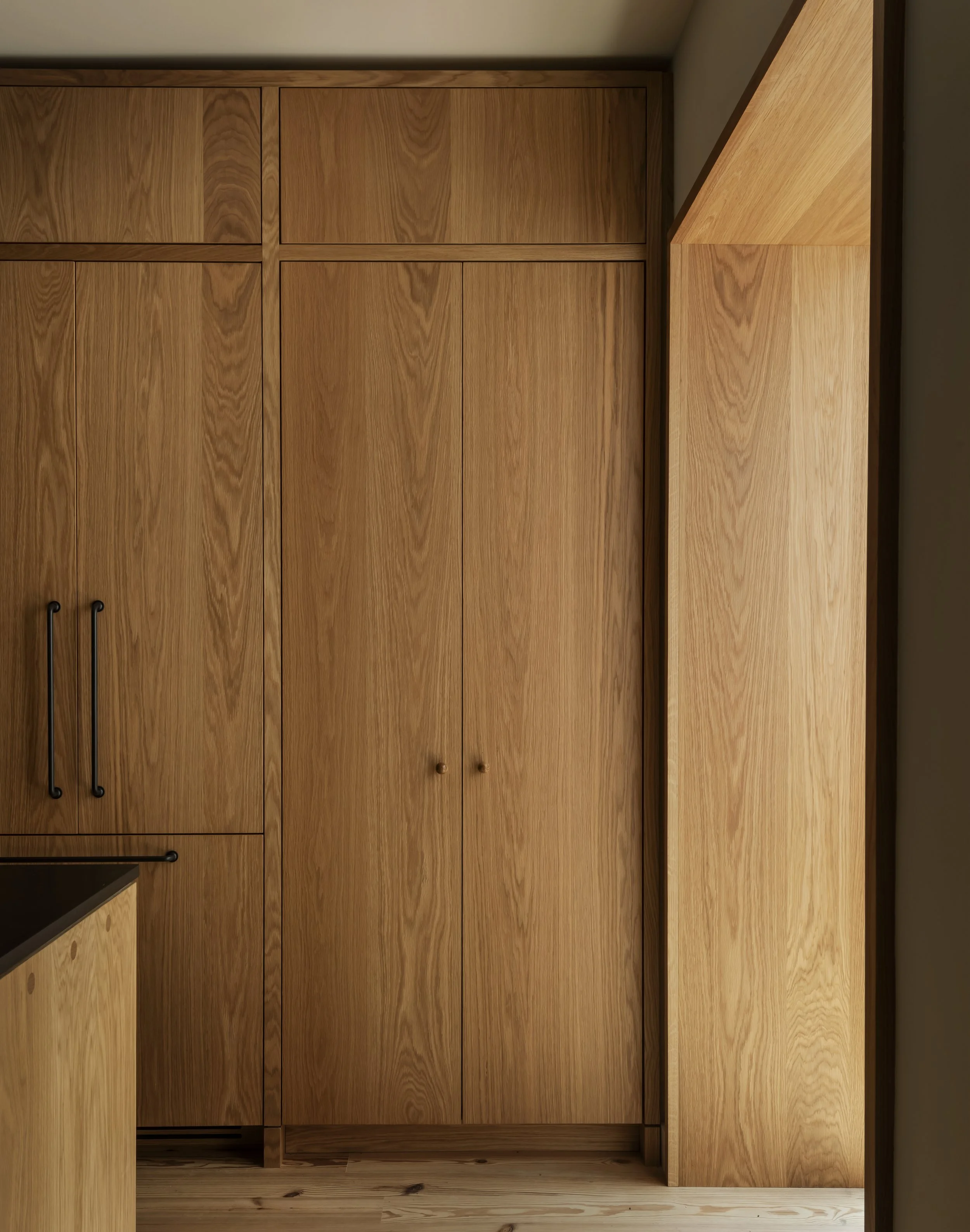 Tucked on a cobblestone corner in historic Fitler Square, this early-1800s brick town house was completely rebuilt behind its original walls to create a bright, modern home for a young family. A new steel-and-glass kitchen solarium and rear addition bring light deep into the narrow 15-foot-wide footprint while making room for a hardworking mudroom and powder room at the alley entrance. Throughout the house, white oak built-ins, reclaimed heart pine floors, and exposed brick honor the original character—maximizing storage and circulation on every level while preserving the integrity of the historic shell. Up top, a vaulted primary suite with skylights, custom millwork, a generous bath, and steam shower turns the once-cramped third floor into a calm retreat above the city.